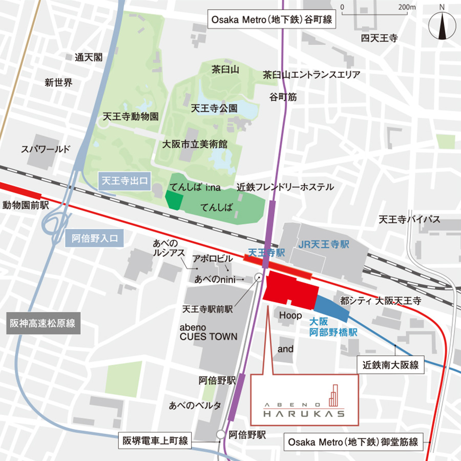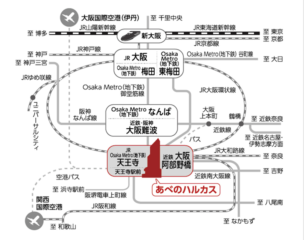 あべの・天王寺ターミナルは、「あべのハルカス」と直結する近鉄南大阪線のほか、JR(大阪環状線・大和路線・阪和線)、地下鉄(御堂筋線・谷町線)、阪堺電車の4社7線が乗り入れ、乗降客数が梅田、難波に続く大阪第三のターミナルです。交通利便性が非常に高く、新大阪駅まで約20分、JRの特急電車やリムジンバスを利用して関西国際空港や大阪国際空港(伊丹空港)には約30分でダイレクトアクセスが可能であり、まさに国内外に向けて開かれた大阪都心部の南の玄関口といえます。