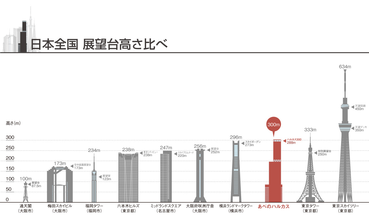 さらに追い風となったのは、2007年の大阪国際空港の航空規制変更です。それまで大阪国際空港の周辺空域には、航空法に基づく建物の高さ規制がありました。あべの・天王寺エリアにおける建物の高さ制限は海抜290mで、海抜17mの上町台地にビルを建設するには実質的に273mが限界でした。しかし、このエリアが規制区域から除外されたことで制限のないビルの建設が可能になったのです。当初の目標は大阪の複合ビルでは最も高層だった大阪ワールドトレードセンタービル(256m)を超えることでしたが、これを機に日本一の高さ(300m)を目指すことになりました。