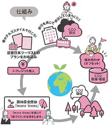 具体的には、一般財団法人more treesが提供するJ-クレジット制度により認証された森林由来のカーボンクレジットを活用し、旅行行程における二酸化炭素(CO2)排出相当分をオフセットします。