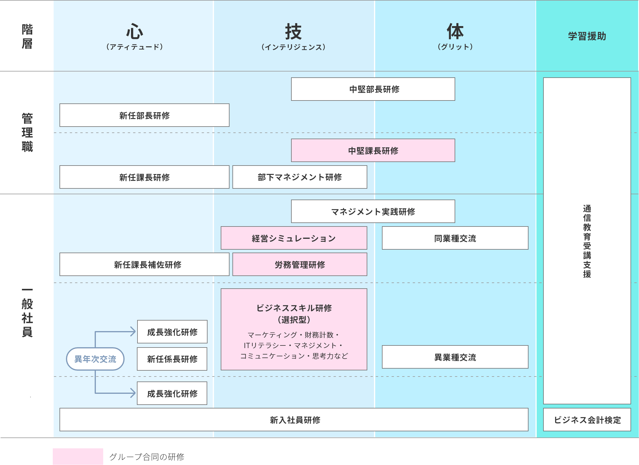 将来的に近鉄グループの経営を担う人材になっていただくことを念頭に、心(人間としての姿勢や仕事に対する姿勢)・技(知識の習得)・体(仕事を成し遂げる力)に重点を置いた体系的な育成プログラムを実施しています。