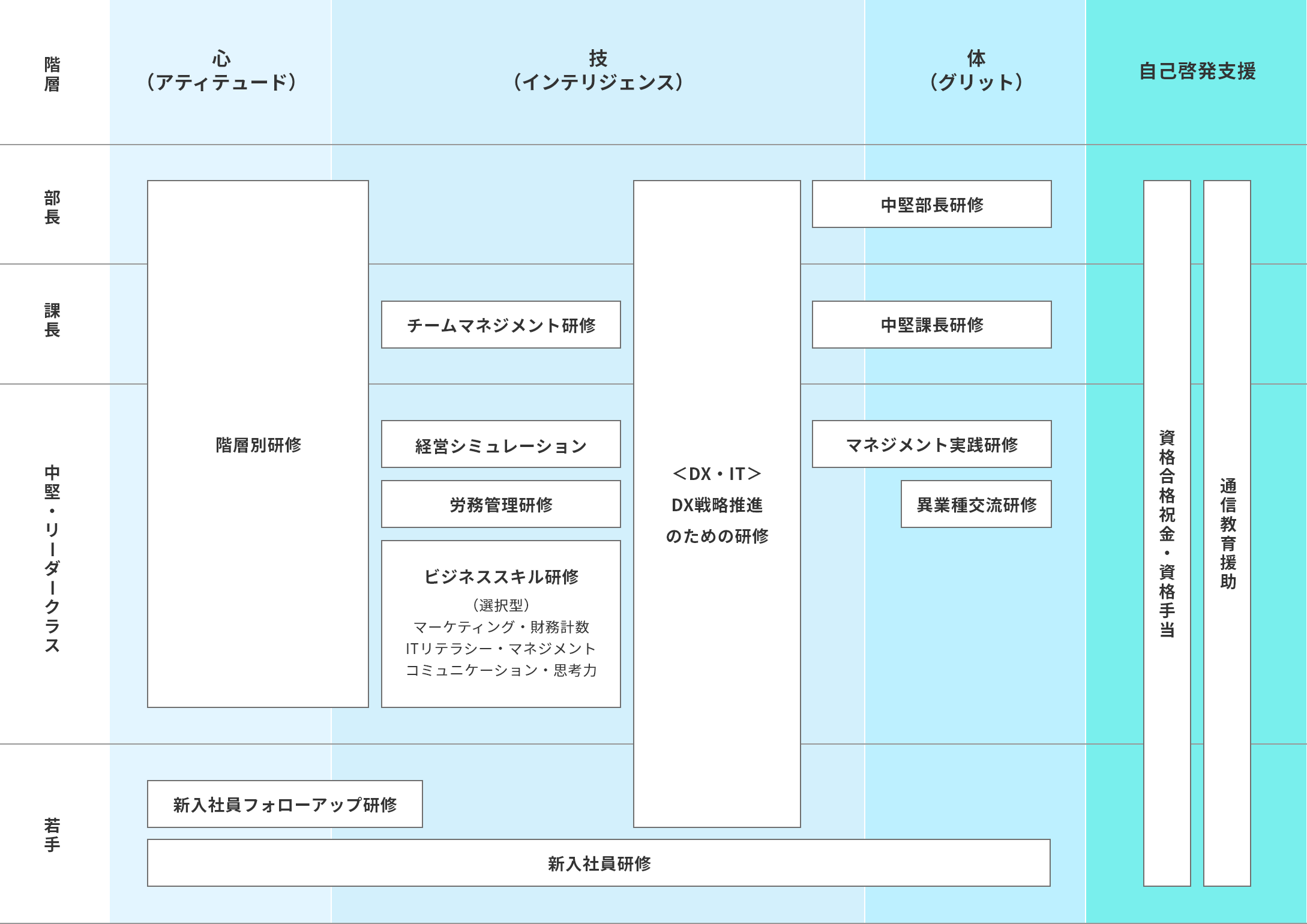 将来的に近鉄グループの経営を担う人材になっていただくことを念頭に、心(人間としての姿勢や仕事に対する姿勢)・技(知識の習得)・体(仕事を成し遂げる力)に重点を置いた体系的な育成プログラムを実施しています。