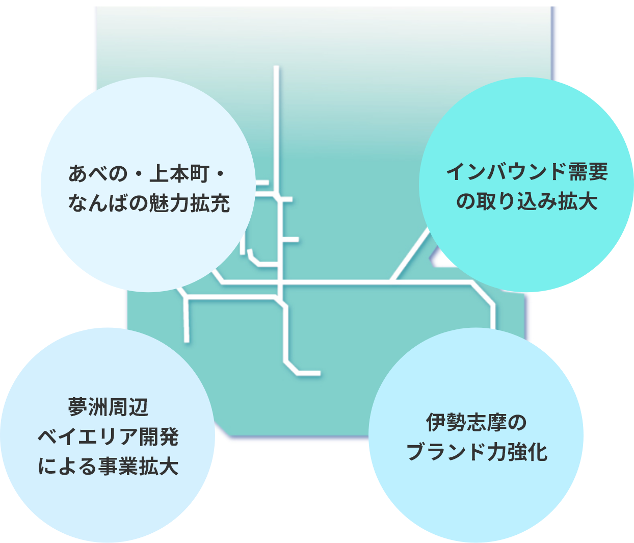 - 首都圏での事業基盤の整備・拡充などを通して、「沿線外でもさらに拡大し、新たなプレゼンスを創出する近鉄グループ」として進化していきます。