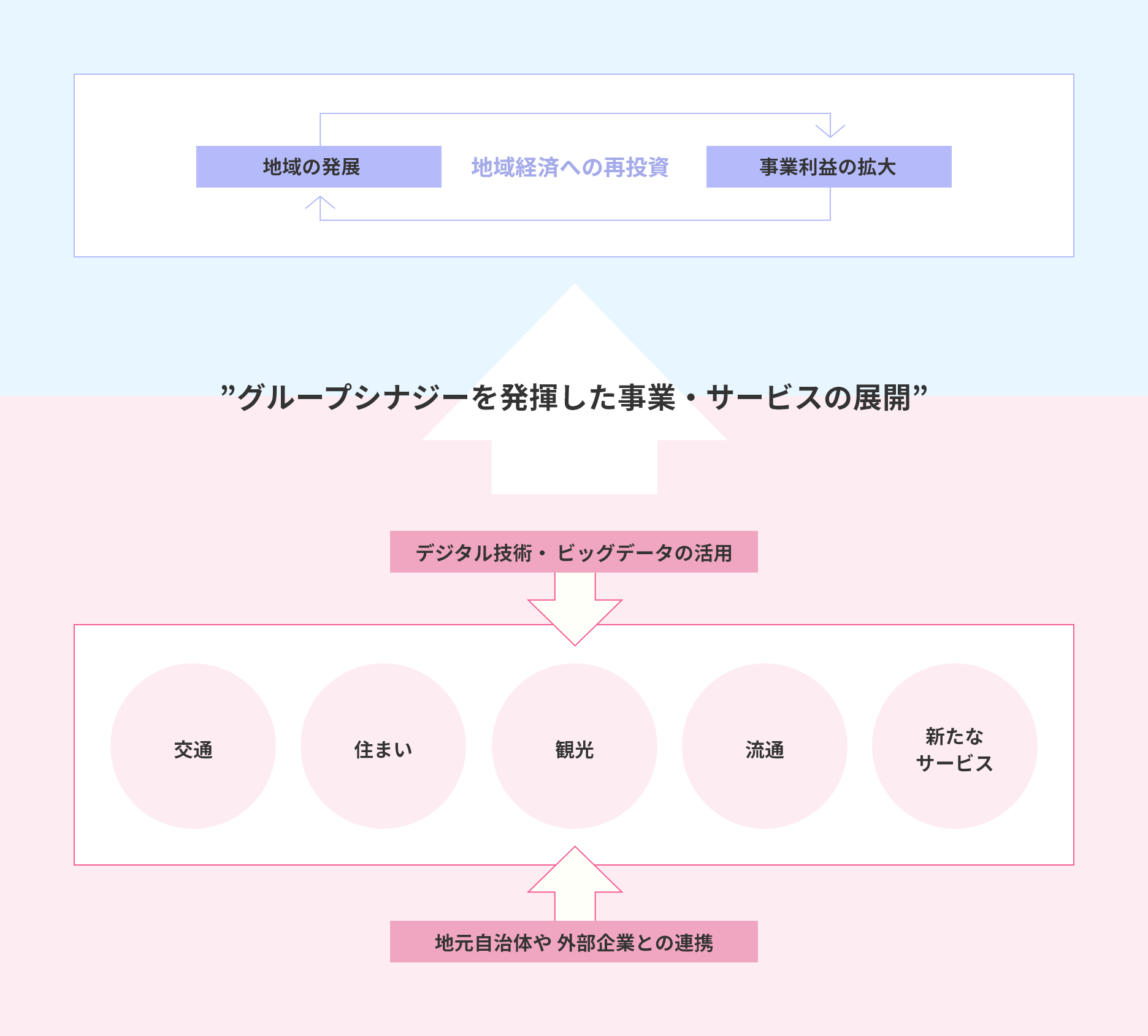 これまでに培った信頼というブランドや成長余地の大きい事業群などを活かし、中長期的に、沿線、沿線外・グローバルでの重点戦略を着実に実行し、あわせて、サステナビリティ、人的資本、DXやグループ連携など、グループ経営強化のための共通基盤の整備も推進していきます。