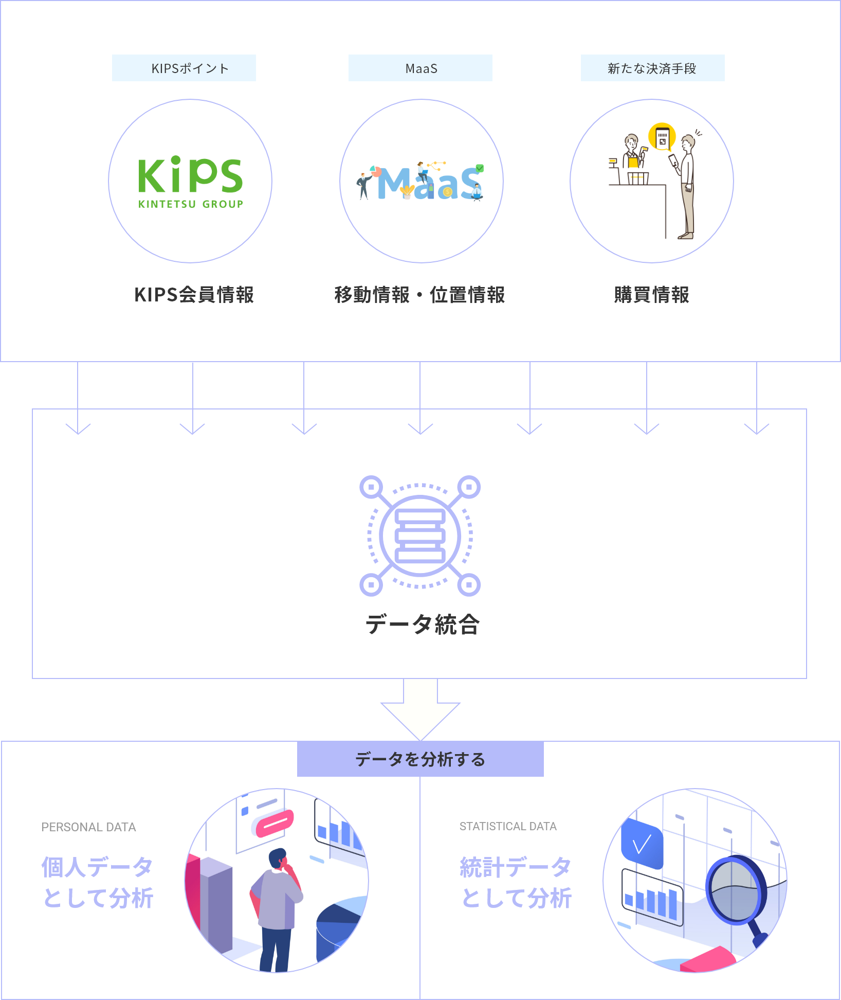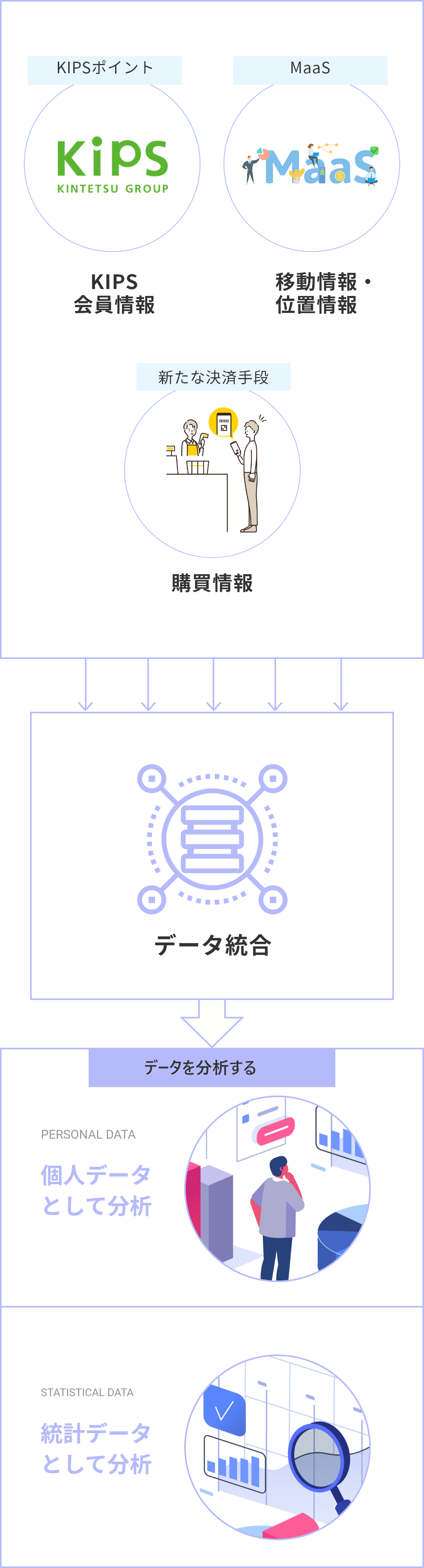 近鉄沿線において、消費者と施設・店舗をデジタル技術でつなぐ新たな仕組み、それが「近鉄沿線デジタルサービスプラットフォーム」です。具体的には、鉄道や百貨店などのスマートフォンアプリに、ポイントサービスや新規の決済サービスなどの機能を付加するほか、お客さまの利便性を高める「MaaSアプリ」で、移動とその目的となるサービスの情報を一体的に提供します。これらのデータを一元的に収集し、グループ各社が持つ各種データと統合することで、グループのポテンシャルを活かした新しい事業やサービスの創出につなげていきます。