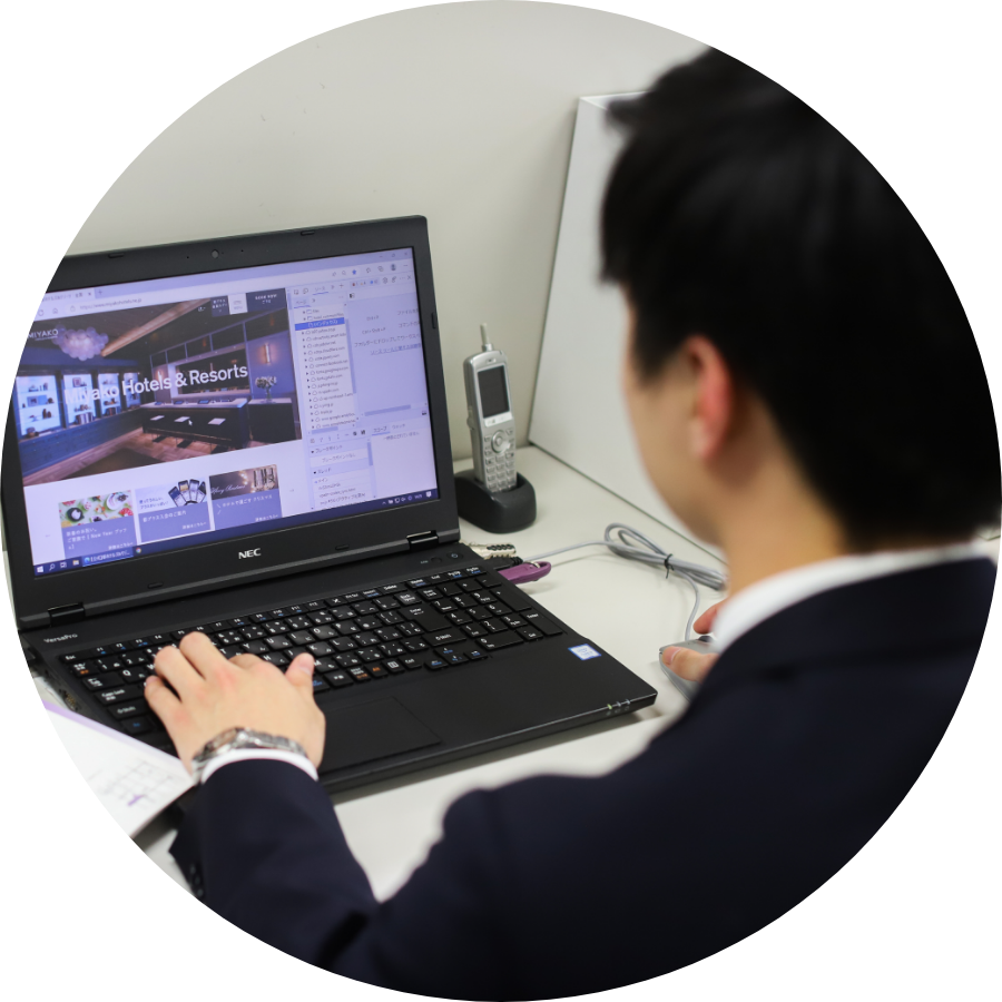 現在は近鉄・都ホテルズの営業企画部に所属しており、マーケティングやプロモーションに関わる業務を担当しています。具体的な業務としては、都ホテルズ&リゾーツのホームページにおいて、イベントに関するページの作成や、操作性と予約率を向上させるためにホームページのデザインや構成の改善などを行っています。お客様が求める情報を発信し、予約に結びつけるため、閲覧数や予約獲得率、流入経路なども分析し、掲載する内容とタイミングについて関係各所との協議を重ねて検討しています。