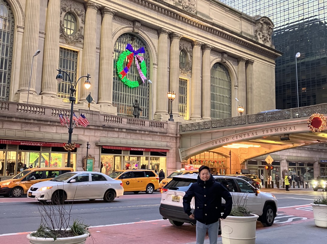 写真は、クリスマスにニューヨークへ遊びに行った時の写真です。当時、記録的な大寒波がニューヨークを襲い、10分も外に出ているのが限界といったほどに寒かったことを今でも鮮明に覚えています。あまりの寒さに空港に到着した足で着用しているダウンを買いに行きました。その他、フライト遅延などいろいろなことが起きましたが、華やかに彩られたニューヨークのクリスマスを体験できたことは今でも良い思い出です。