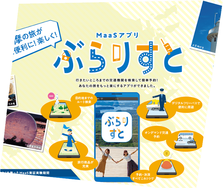 MaaSとは複数の移動サービスを最適に組み合わせて、検索・予約・決済等を一括で行うサービス。移動の利便性向上や地域の課題解決にも資する重要な手段です。当社では、2019年度に沿線の重要観光地である伊勢志摩エリアの志摩地域において、観光型MaaSの実証実験を行いました。オンデマンドのバス・船・タクシーを整備したほか、開発したMaaSアプリ「ぶらりすと」上でフリーパスや旅行商品を販売。この実験は国土交通省により「新モビリティサービス推進事業」の「先行モデル事業」に選定されました。今後も近鉄グループでは、MaaS実現に向けた取り組みを進めます。