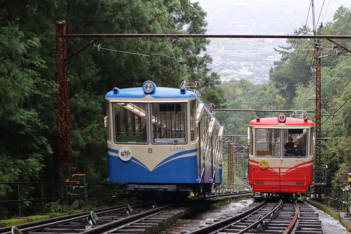 外装のリニューアルは12年ぶりで、9月17日に赤色(7号車)と青色(8号車)のケーブルカー2台が揃って登場しました。昭和時代(1957年~1987年に運行)の車体カラーに復刻塗装したほか、信貴山と縁の深い寅に因んだ、新デザインの寅のヘッドマークと側面のラッピングを施しました。