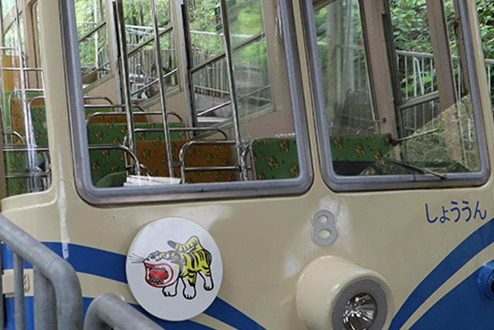外装をリニューアルした西信貴ケーブルのケーブルカー 寅のヘッドマークと側面ラッピング