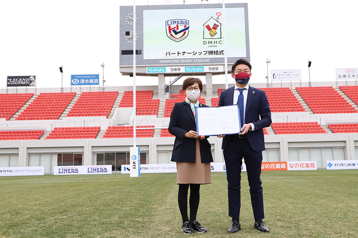花園近鉄ライナーズのホストゲーム開幕節となる三重ホンダビート戦試合前には公益財団法人ドナルド・マクドナルド・ハウス・チャリティーズ・ジャパン(以下DMHC)とライナーズとのパートナーシップ協定の締結式が行われました。この協定は、スポーツやボランティア活動を通じ、DMHCによるドナルド・マクドナルド・ハウス事業およびShare Heart for sick kids事業の支援、ラグビー事業に対する周知活動が目的です。ライナーズの飯泉景弘ゼネラルマネージャーは「新しく発足したリーグワンには、従来の企業スポーツの部分から、より地域に密着して社会に貢献する使命を踏まえています。その中で私たちライナーズが社会のためになるようなことができないかと模索している中、東大阪市からDMHCを紹介いただきました。パートナーシップを結ぶことで、寄付活動を積極的にするだけでなく、子どものためにラグビーの力で勇気と元気を与えたい」とあいさつしました。