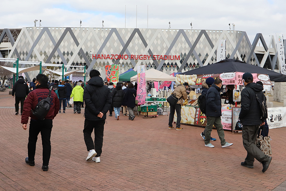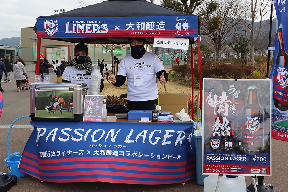 ラグビー場前の噴水広場では、地域の魅力発信ブースや来場者向けのおもてなしブース、キッチンカーなどを展開する「花園ハッピーパーク」を開催。ラグビー観戦客以外も参加できるイベントの開催により、地域のにぎわい創出を目指すとともに試合前後を盛り上げる演出を行いました。会場ではさまざまな飲食ブースが出店し、近鉄リテーリングが運営するクラフトビール醸造所「大和醸造」と花園近鉄ライナーズがコラボしたライナーズラベルのクラフトビール「PASSION LAGER」も販売されました。そのほか、花園近鉄ライナーズのオフィシャルサポートソング「チャンピオンシップ」を歌うボーカルユニット「HAND DRIP(ハンドドリップ)」も登場したステージイベント、海底火山の噴火で被害を受けたトンガへの募金活動なども行いました。「花園ハッピーパーク」は、2022年シーズンのホストゲーム時に開催される予定です。