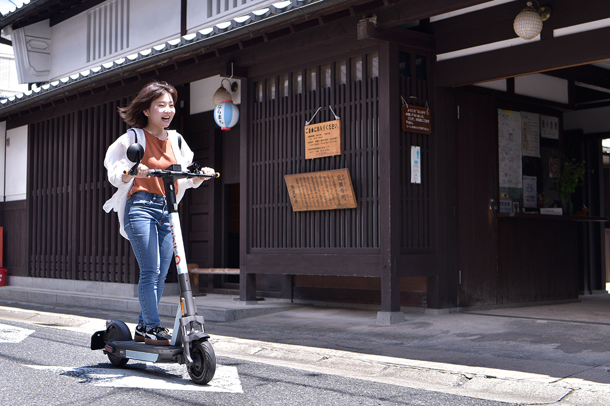 電動キックボードの時速は15キロ程度で、走行可能エリアはならまちを中心とした交通量が少ないエリアに限られています。