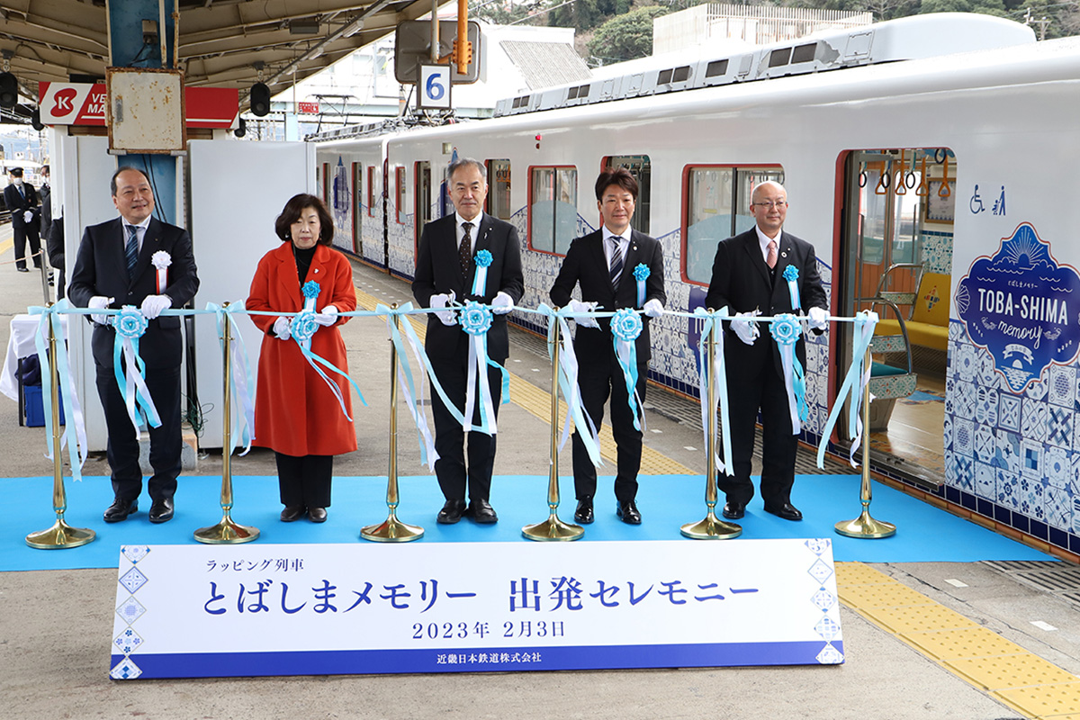 近畿日本鉄道(以下「近鉄」)は2月3日、鳥羽駅で新たな観光ラッピング列車「とばしまメモリー なみの章」の出発式を開催しました。